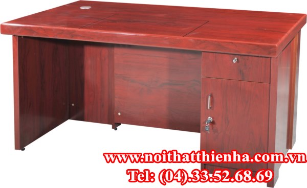 Bàn trưởng phòng gỗ sơn cao cấp làm từ gỗ công nghiệp dán giấy vân gỗ, sơn PU trang trí tạo bề mặt và bảo quản. Mặt bàn hình chữ nhật, yếm bàn phối màu giấy trang trí. Bên trong bàn bên phải là hộc 1 ngăn kéo + 1 cánh mở. Chưa có bàn phím
