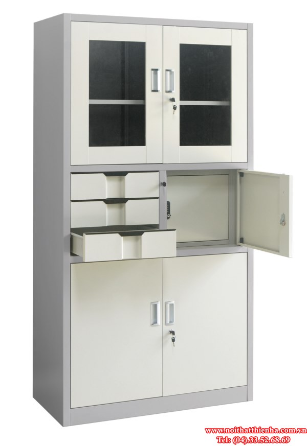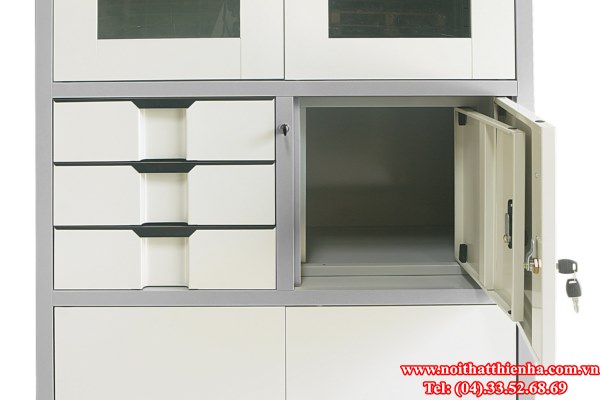 Tủ sắt sơn tĩnh điện chia làm 3 khoang. Khoang trên cùng có 1 đợt di động 2 cánh kính có chung 1 khóa. Khoang ở giữa bên trái có 3 ngăn kéo, bên phải có cánh sắt mở có khóa mã. Khoang dưới cùng có 1 đợt di động, hai cánh mở có chung 1 khóa. Sơn cánh màu kem, các phần khác màu ghi